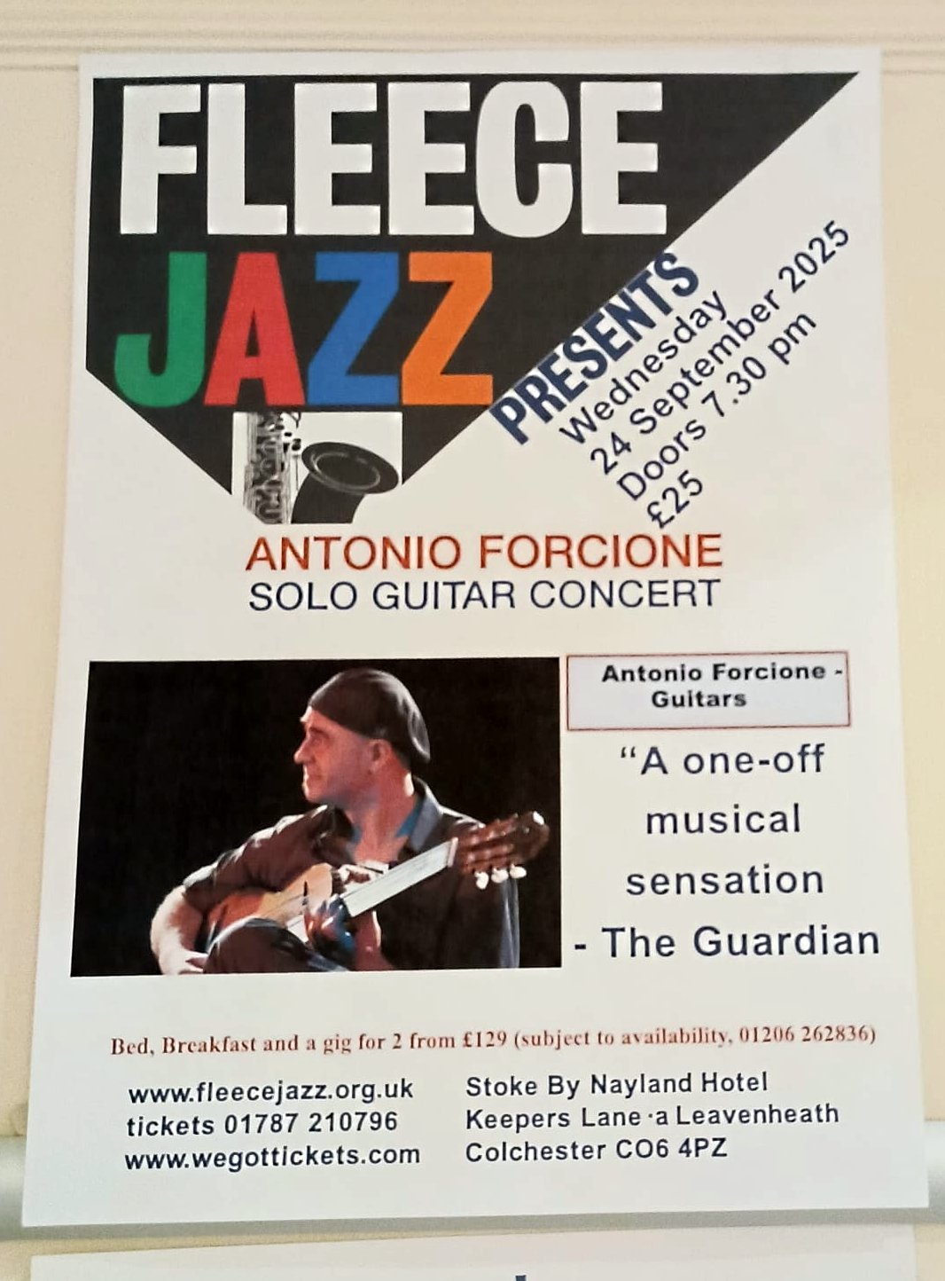 Over two years after our last visit, we booked a return to Stoke by Nayland hotel and spa and to Jazz At The Fleece to sample the guitar delights of Antonio Forcione. In the interests of all I should disclose that we hadn’t heard of Antonio, which is of course a sad reflection on us rather than the artist, but we were intrigued by the short bio and reviews on the Fleece site and decided to give it a shot. As an aside, the Jazz at the Fleece offer at the hotel (overnight stay, two tickets to the concert and breakfast the following morning is a cracking deal, in my very humble opinion!