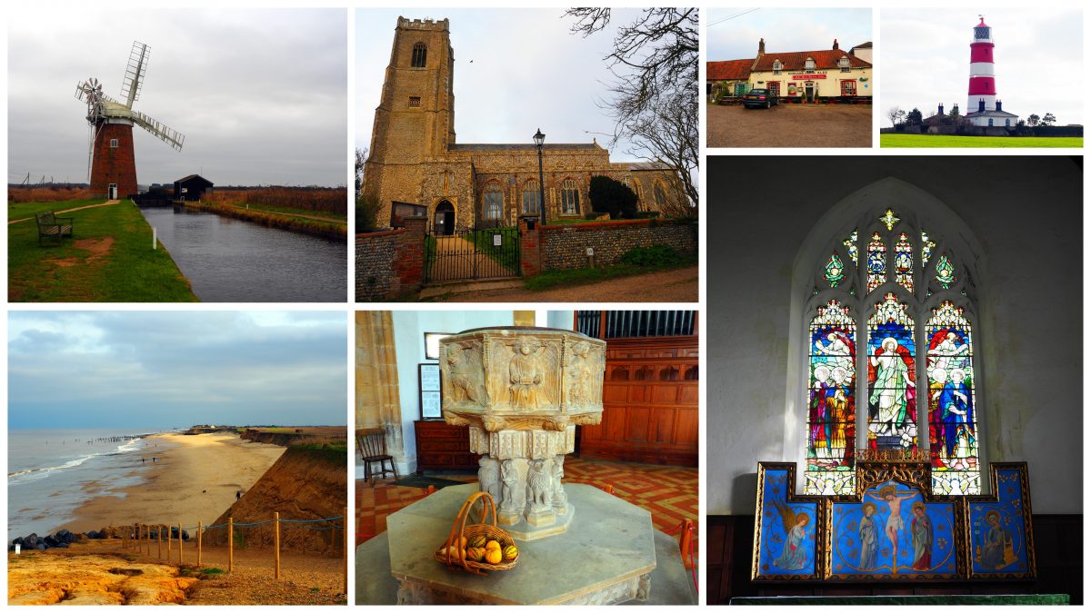 Final stop was a quick visit to Happisburgh where we parked up at the beach car park, close to the lighthouse but a fair track from the village centre, such as it is. According to the (very good) village website, it has an exciting long-term future, despite the ongoing coastal erosion. We didn’t really spend enough time there to justify an opinion, but the Church, community pub and independently run lighthouse were all viewed. The lighthouse in particular is worth a mention, saved from closure by the Friends of Happisburgh Lighthouse; originally scheduled for closure in 1987, it was visited by the Queen in July, 1990. First operational in 1790, the light mechanism is now controlled by a light sensor, which comes on automatically at dusk. And although St. Mary’s Church is often cited as one of the best churches (Jenkins’ “England’s thousand best churches” for example), it is the mound, bereft of headstones but the mass grave of the crew of the HMS Invincible foundered offshore on 16th March 1801 on its way to join Nelson’s fleet (119 of the crew are buried here) that seems most affecting.