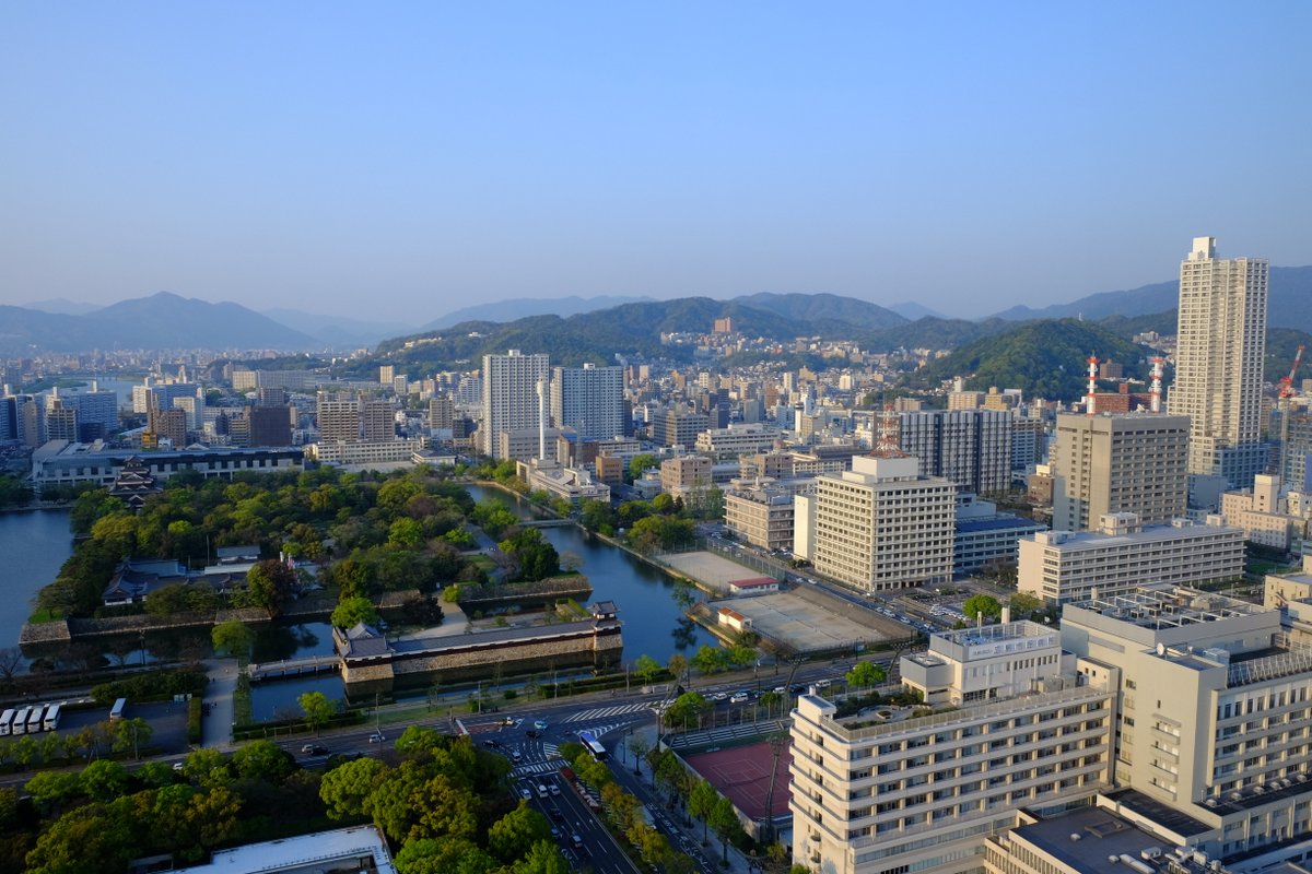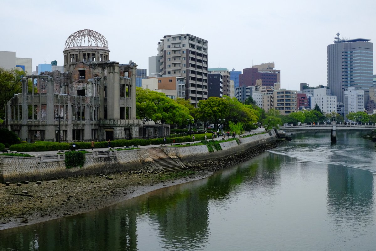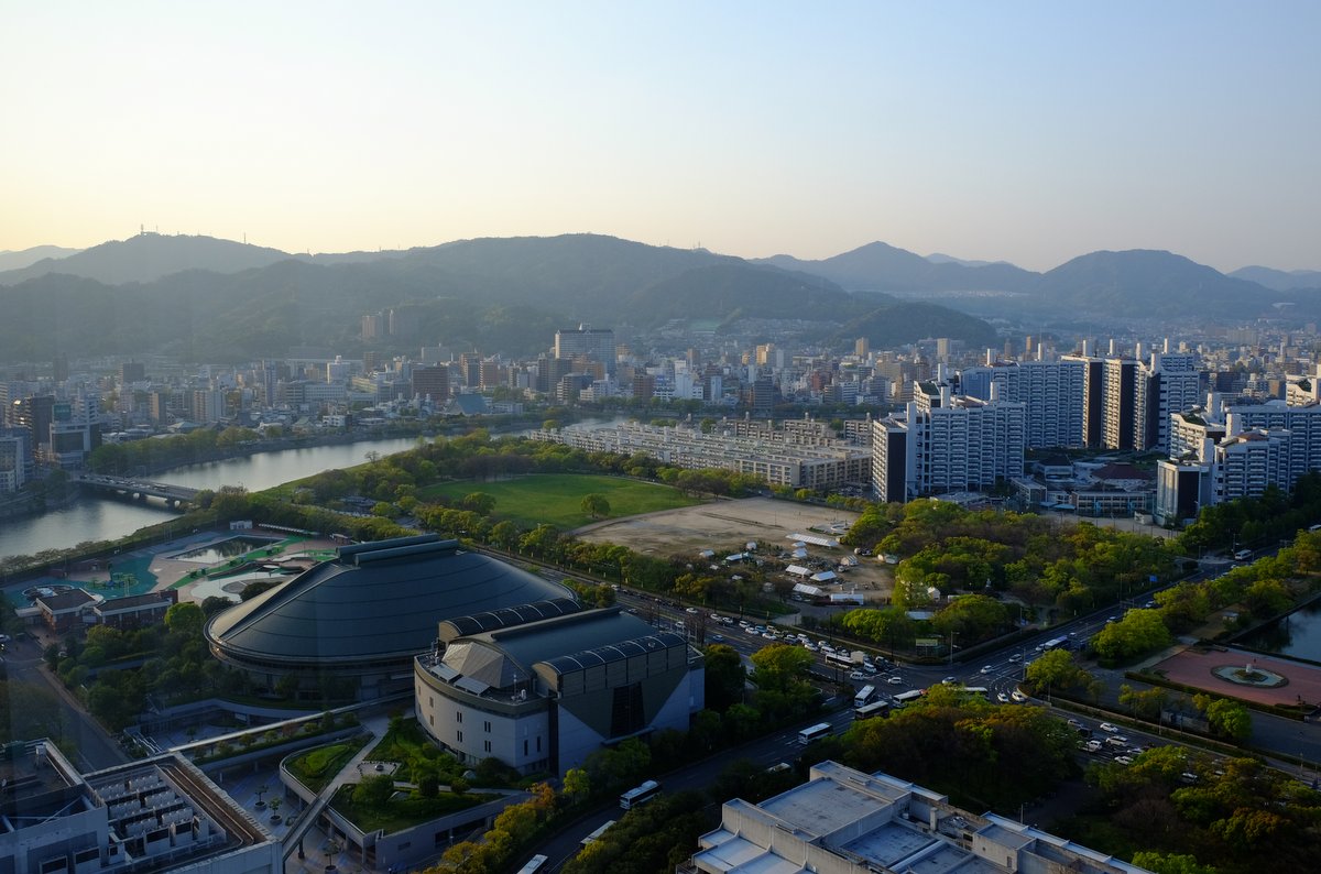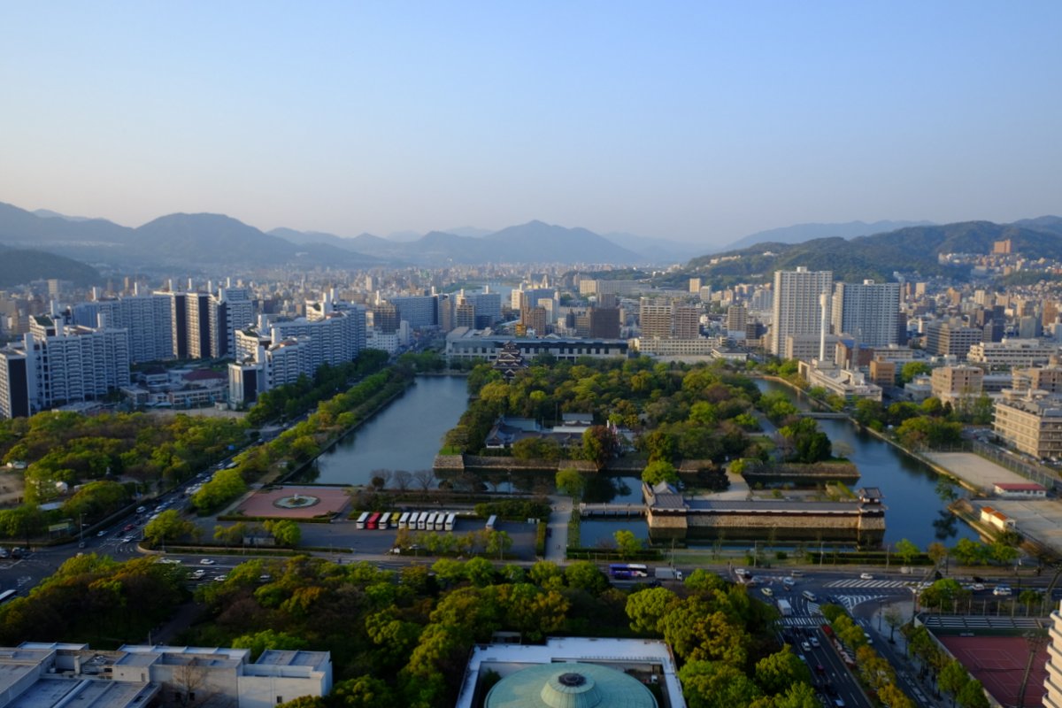The Promotion Hall and rebuilt Hiroshima as backdrop