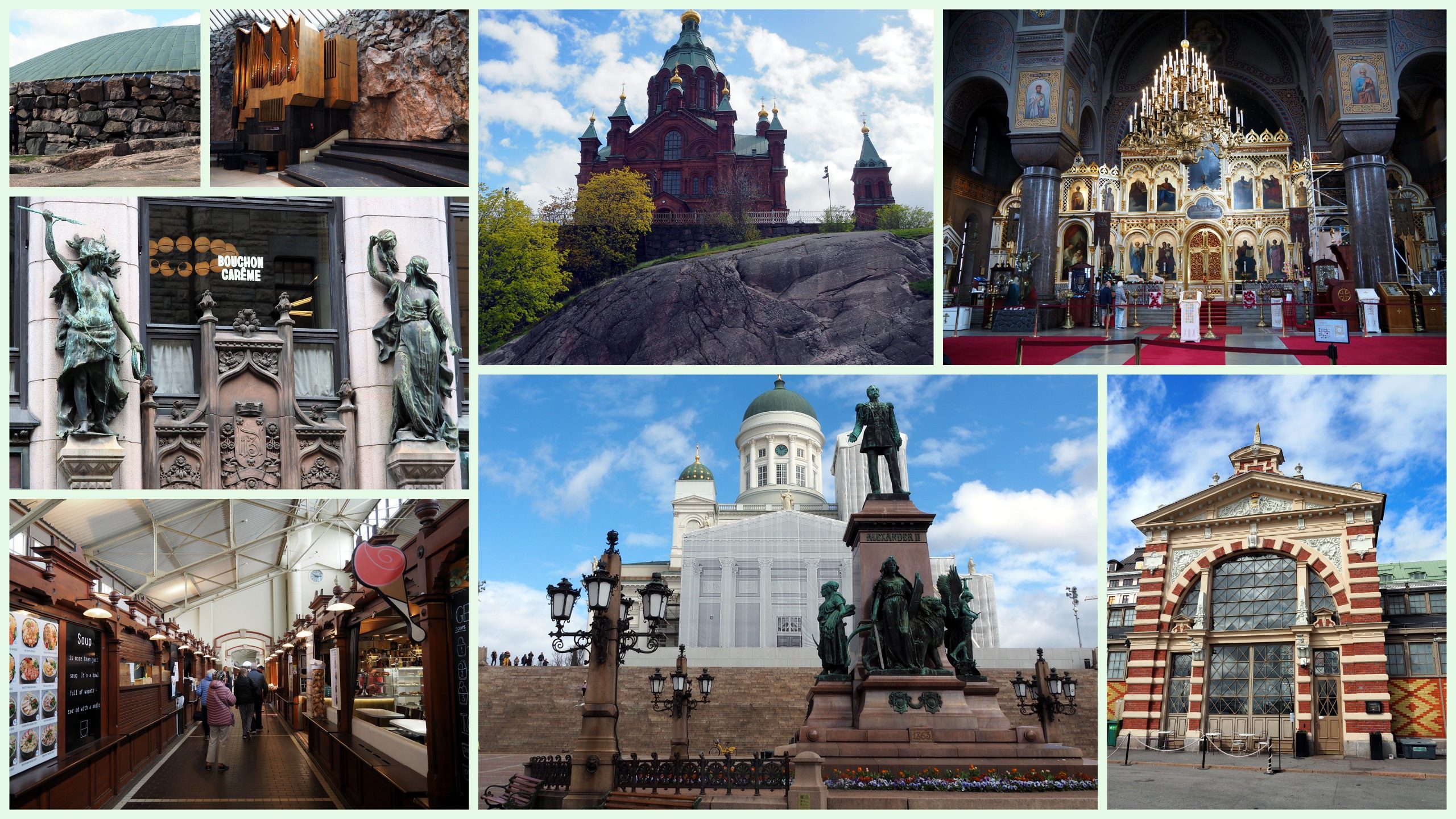 We have been to Helsinki before, but we both remember very little, other than it was raining cats and very large dogs and we were therefore prevented from venturing far from the Senate Square area. This time round, it stayed largely dry (save for the occasional, minor shower) so we could venture further afield. Off the shuttle bus (only a couple of ports allowed for direct walking access from the ship to town or city centre) we headed straight for the Old Market Hall, which showcased a wide variety of local delicacies and was actually opened in 1889 – the problem with a cruise however is you very rarely arrive at such establishments feeling a bit peckish and therefore rarely, if ever, sample such treats. And who wouldn’t be up for a little bit of whale meat!! We then ventured up the hill (thought we’d get it done early) to visit the Uspenski Cathedral, which apparently is the largest orthodox church in Northern and Western Europe and promised to feature beautiful icons and paintings. Hopefully the collage gives a little of its flavour. After a short break to review the map (I thought Swedish maps were tricky but they are a breeze in comparison to the Finnish version) we plotted a walk, via the Helsinki Cathedral and Senate Square, to the Temppeliaukio “Rock” Church that is, somewhat unsurprisingly, built into solid rock. Another Lutheran church (as is the Cathedral), it was designed by the Suomalainen brothers, has a fairly austere interior and was opened as recently as 1969. After revitalising ourself with a coffee and Finnish gateau (very nice, very filling and rather proving my earlier point) we returned to the shuttle, somewhat accidentally going through the Esplanade Park, which lays claim to be Finland’s most famous – very pleasant, but surely not!