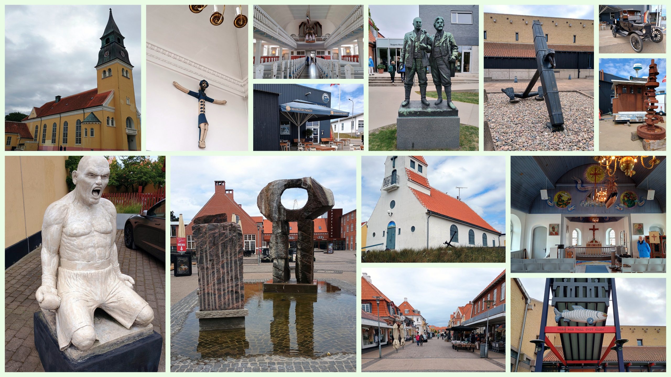 Our final destination was to Skagen, northernmost town in Denmark, on the east coast of the Skagen Odde peninsula in the far north of Jutland. The Port of Skagen is Denmark’s main fishing port and it also has a thriving tourist industry, attracting 2 million people annually. There was a marked path (a painted blue line) out of the port, with good reason as the fishing industry has led to a selection of side streets and avenues within the port environment. We thought Skagen was perfect walking territory for two old codgers like us and we thought the ‘main street was delightful. The Skagen painters, you’ll certainly not be surprised to learn, were based here. We visited the Skagen Church, built in 1841 to the design of Christian Frederik Hansen. Incidentally, on the way back to the ship, we found our way into the Svenska Sjömanskyrkan, a Lutheran church close to the harbour. This proved to be a lovely little church that was dedicated to fishermen. It is a relatively simple church but is painted with some delightful murals depicting fisherman and their activities. The Skagen main street was also as close as we got to splashing out on this holiday but we both resisted and settled instead for a local patisserie and the best coffee of the whole trip, along with a very fine pastry, the name of which has now eluded me.