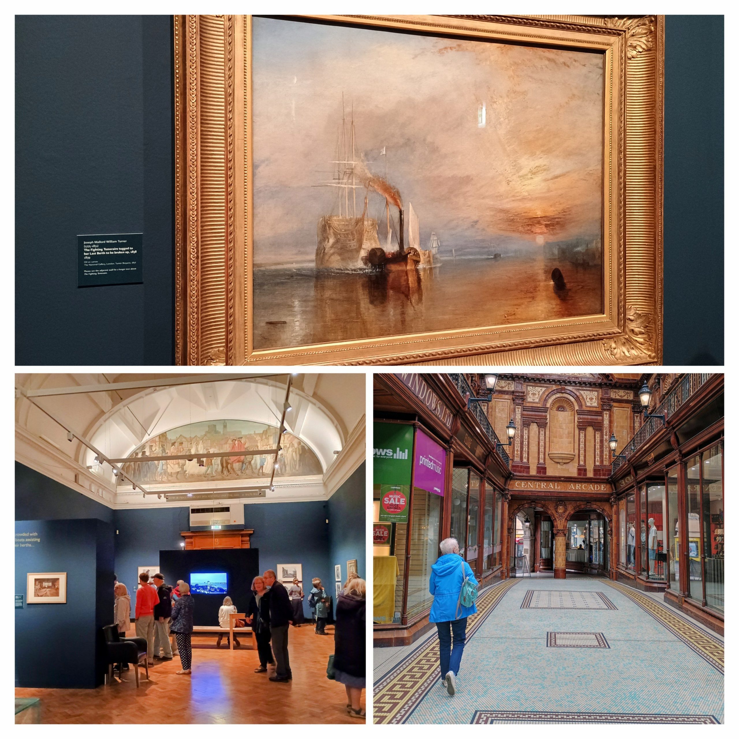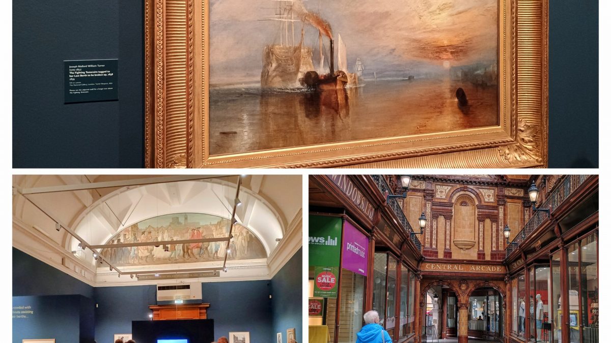 - We finally got to the Turner exhibition at the Laing Gallery in Newcastle. Entitled “Turner: Art, Industry & Nostalgia“, it featured over twenty Turner works with, as the centrepiece, “The Fighting Temeraire“(1839). The latter masterpiece, which I am convinced I’ve seen before in the Tate Modern, made absolute sense as a focal point for an exhibition that explores the rise of steam power and industry in Britain. This is of particular relevance to the North East, with ship building still very much part of the identity of the region (see museum above). It is I think significant for the North East and its industrial heritage that the two steam tugboats that pulled the Temeraire in reality – the Samson and the London – were manufactured on Tyneside. Wonder whether or not they got to choose this very specific painting to display as it was of course on loan from the National Gallery. Good to see it so well attended, all OAPs were charged a very reasonable fee (one for us oldies) and the Gallery building architecture was also worth a wander around.