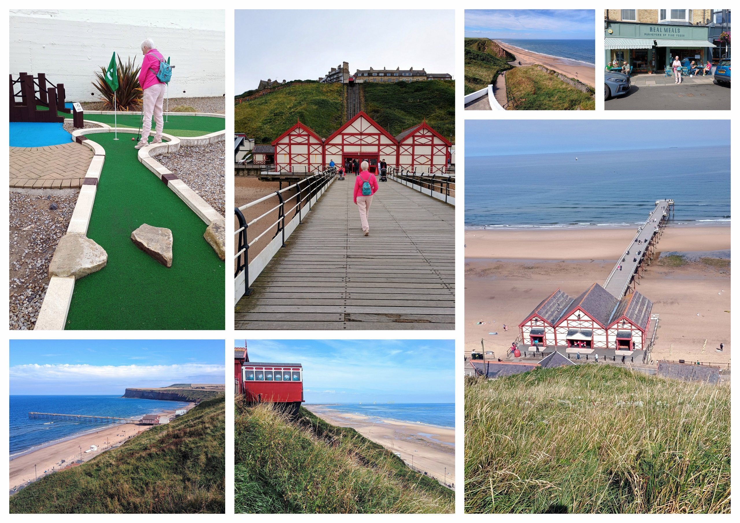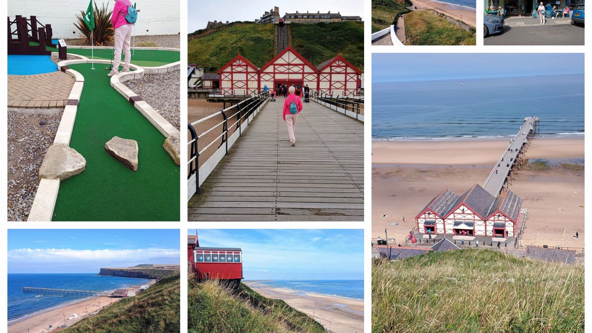We also visited the coastal town of Saltburn-by-the-Sea, a seaside town around fifteen minutes drive from the Hall. I guess it would now be described as a relic of a different era, but we enjoyed our day there. A walk along the a Grade II* renovated pier no less and the only pleasure pier on the whole of the North East and Yorkshire coast. Then a brief look at the Saltburn Cliff lift (pedants at this stage would point out that we saw the tramway first – and I am a pedant obviously, so I will point out that as we were on Marine Parade on the cliff top we saw the funicular on the way down to the pier. It is nonetheless one of the world’s oldest water-powered funiculars. After the opening of Saltburn Pier in 1869, it was concluded that the steep cliff walk was deterring people from walking from the town to the pier. Sadly, it was out of action when we were there (although they did appear to be working on it), so we had to get to the pier the old fashioned way. Down close to the pier we came across a ‘crazy golf‘ (am I still allowed to phrase it as such or must I now use the new ‘adventure golf’ moniker. Whichever, we tied the game but Mrs. No Name won a free round on the ‘extra hole’ so we had to play again – I shall refrain from mentioning who won the second. Lovely lunch at ‘Real Meals‘ as a reward for climbing back up from the pier.